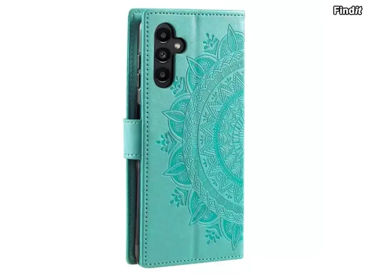 Mintunvihreä suojakotelo Samsung Galaxy A57 5G puhelimeen, jossa on upea mandala-kuvio painettuna nahkaan. Näissä kuorissa on kolme paikkaa luottokorteille, setelitasku sekä kiinnike puhelimelle. Suojakotelon avulla voit tukea puhelimen vaaka-asentoon ja katsoa esimerkiksi elokuvaa puhelimen näytöltä. Avattava kansi antaa hyvän suojan puhelimen näytölle.
