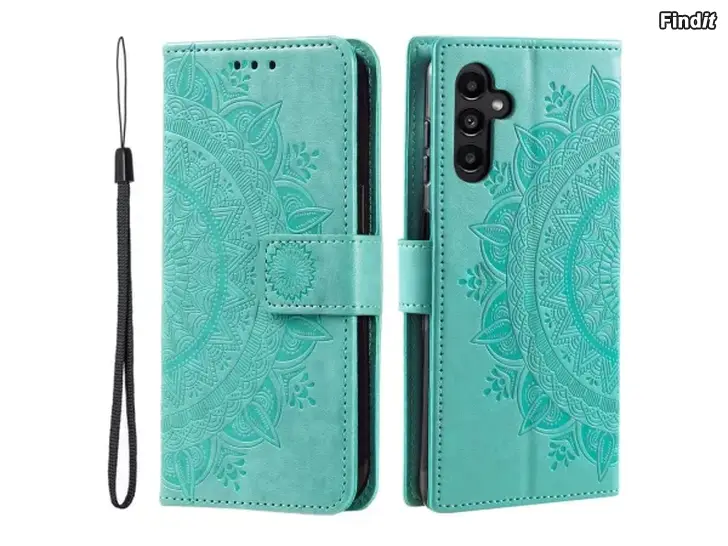 Mintunvihreä suojakotelo Samsung Galaxy A37 puhelimeen, jossa on upea mandala-kuvio painettuna nahkaan. Näissä kuorissa on kolme paikkaa luottokorteille, setelitasku sekä kiinnike puhelimelle. Suojakotelon avulla voit tukea puhelimen vaaka-asentoon ja katsoa esimerkiksi elokuvaa puhelimen näytöltä. Avattava kansi antaa hyvän suojan puhelimen näytölle.