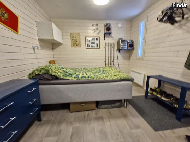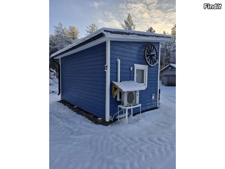 Lämpöeristetty mökki, ulkomitat 5,34m×3,50m, sisätila 13,7 m2. Daikin ilmalämpöpumppu, 2×1000W patterit. Kalusteet saat halutessasi mukaan, sänky 1,40m leveä. Pyyhekuivain. Skaalan ikkunat ja ovi. Rakennettu 3v sitten sisätilossa. Talar också svenska. 050 375 8231