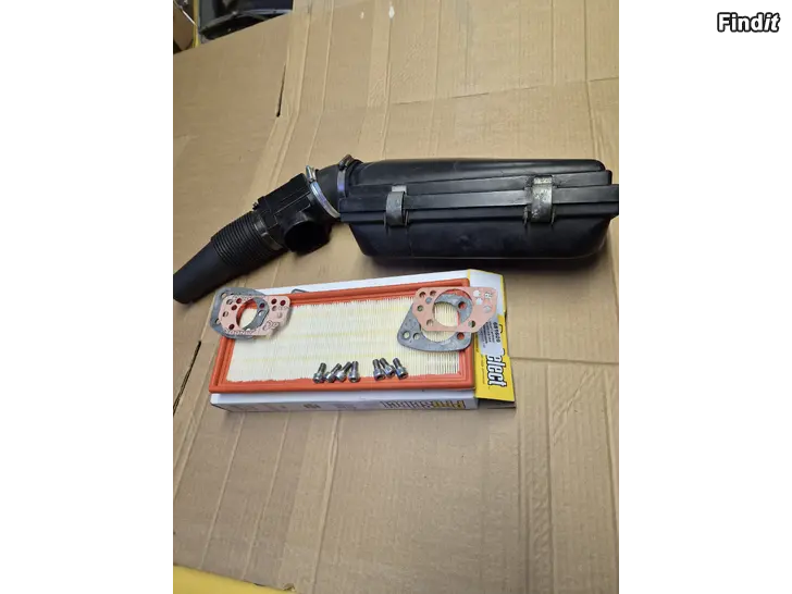 Hyväkuntoiset Volvo tupla SU-kaasuttimien ilmanpuhdistajan kotelo, termostaatti,letkut, kiinnitystarvikkeet ja uusi filtteri. Sopivat myös Amazoniin, P1800 ja muihin B18 ja B20 moottoreihin.