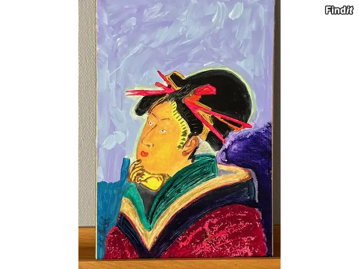 En färgglad målning föreställande en japansk geisha med traditionell frisyr och klädsel. Konstverket har en unik stil och uttryck. olja på duk med kilram. Peter Glennfalk nr 24