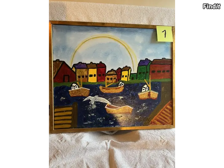 En charmig målning som föreställer en kustby med båtar på vattnet. Naivistisk utryck. Färgstarka hus och en ljus himmel skapar en glad och inbjudande atmosfär. Olja på canvas med kilram. Höjd 48,5 cm. Bredd 57,5 cm, inklusive Guldfärgad träram. Peter Glennfalk nr 1.