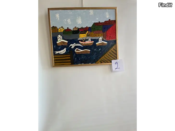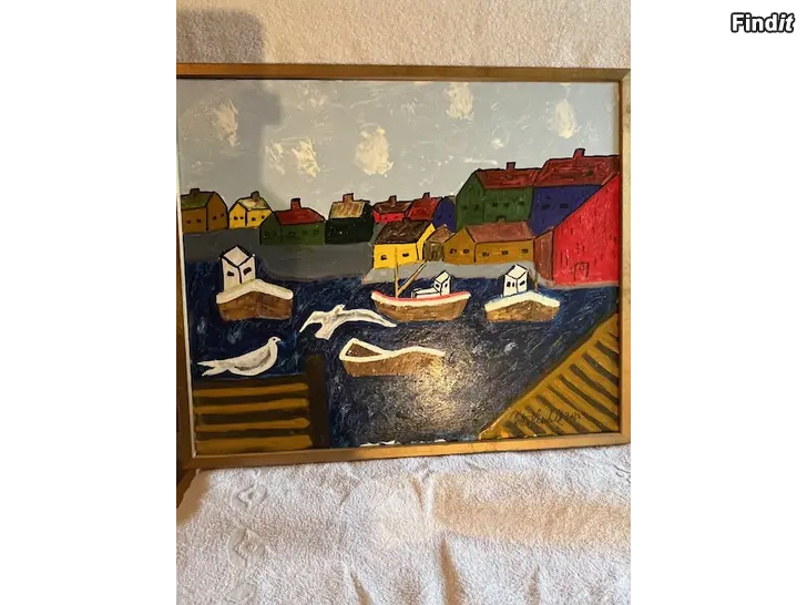 Färgglad tavla med motiv av en kustby. Målningen visar hus, båtar och fåglar i en naivistisk stil. Olja på canvasduk med kilram. Höjd 48,5 cm x Bredd 57,5 cm. inklusive guldfärgad träram. Peter Glennfalk nr 2