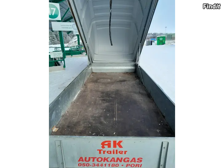 Kuvan AK Trailer peräkärry myydään. Mitat 350cm x 150cm. Laidat 35cm, kuomu 100cm korkea. Kippitoiminto, näppärä mönkijän ja