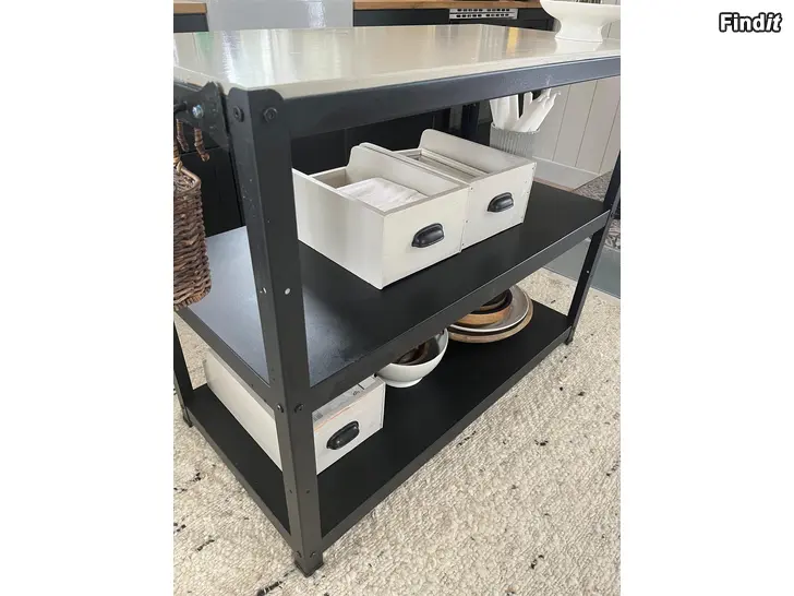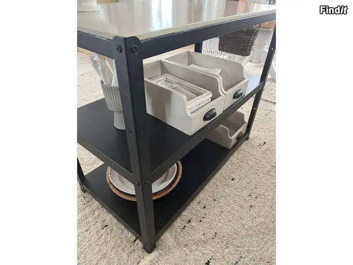 Tukeva säilytysjärjestelmä kestää kosteutta, likaa ja raskasta kuormitusta. Ollut käytössä kesämökin keittiösaarekkeena. Työtason nouto Vaasa, Impivaara.