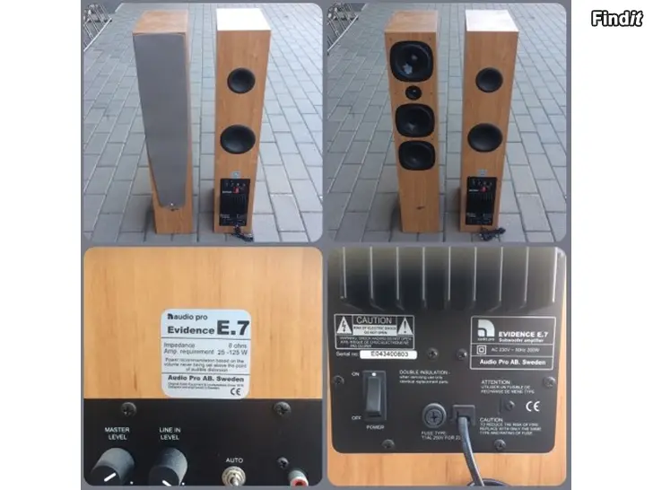 E. Audio Pro Evidence e7 kaiutinpari. Bassorefleksi kaiuttimet sisäänrakennetulla 150 watin subwooferilla. Kaiuttimien tekniset tiedot löytyvät linkistä: https://www.manualslib.com/manual/211291/Audio-Pro-Evidence-E-7.html