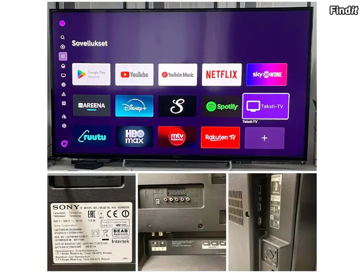 A. SONY 60W605B LED televisio. Hyväkuntoinen Full HD televisio. Paneelin pinnassa on muutamia pieniä naarmuja, mutta nämä eivät vaikuta television katseluun. Mukaan tulee kaukosäädin ei alkuperäinen. Television tekniset tiedot löytyvät linkistä: https://www.sony.fi/electronics/support/televisions-projectors-lcd-tvs/kdl-60w605b/specifications