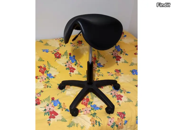 Korkeussäädettävä satulatuoli on oivallinen työtuolina. Tuolin istuinosa pyörii, helppo pyörähtäen toimia eri puolilla työstäen. Uuden kuntoinen.