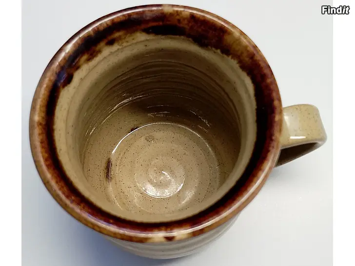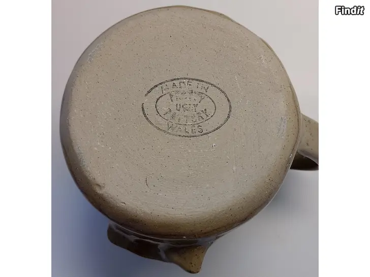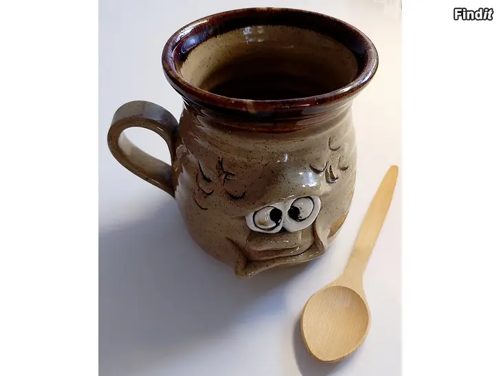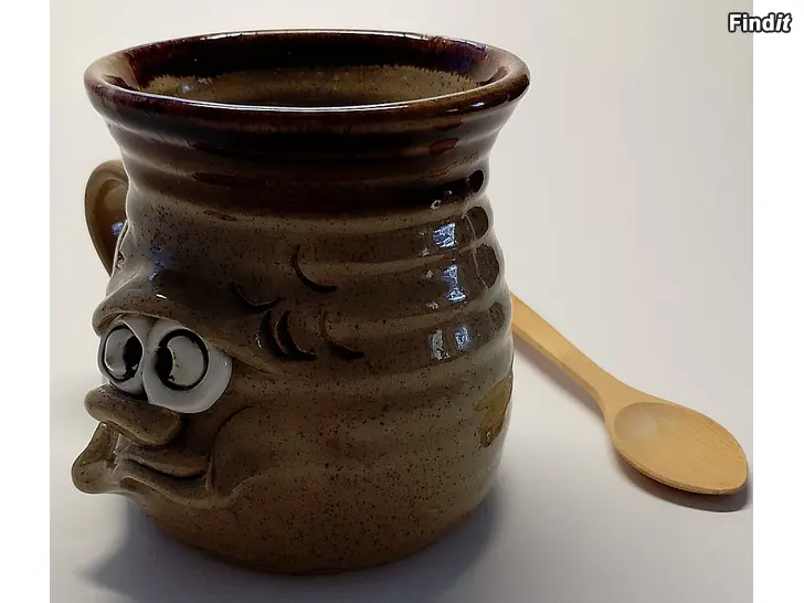 Pretty Ugly Pottery –keramiikkamuki ja puulusikka, Made in Wales siisti, ollut käyttämättä, vain koristeena. Korkeus 95 mm, ylähalkaisija 85 mm, kädensijan kohdalta leveys noin 110 mm, lusikan pituus noin 138 mm. En muista, kuuluivatko alun perin yhteen? Nyt nämä kuitenkin myydään yhdessä.