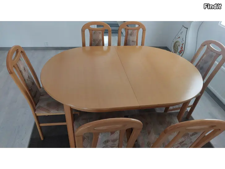Pöytä 100 x 150 +jatko 400 cm sekä 6 kpl tuoleja