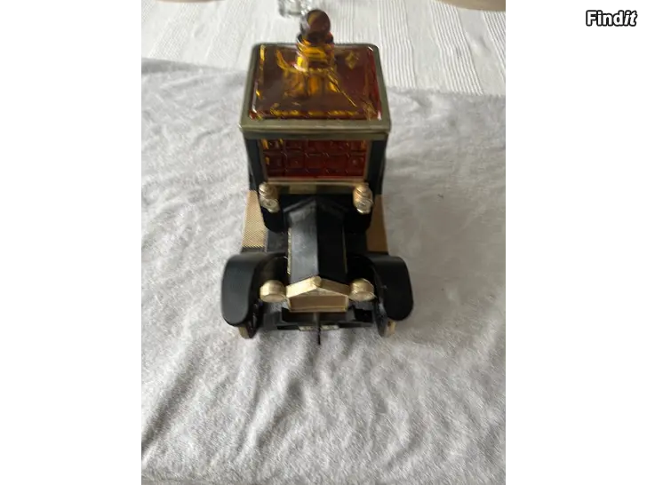 En bilformad karaff med tillhörande glas. Speldosa när man lyfter karaffen. Karaffen är placerad i bilens mitt, och sex små glas är placerade på bilens baksida. Bilen är svart med guldfärgade detaljer och röda inslag. Vintage musikalisk spritkaraff – 1915 Ford T Car – Retro
