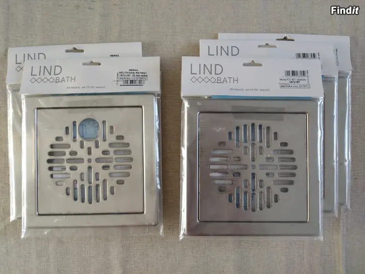 2 st golvbrunnsskydd 197x197 mm med hål för extra slang tex. handfat el. tvättmaskin + 3 st vanliga i samma storlek utan hål. Nya och oanvända. Alla som ett knippe.