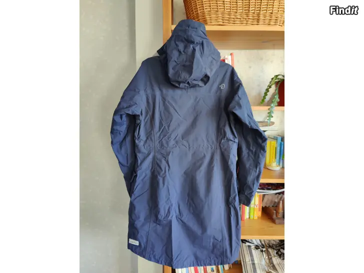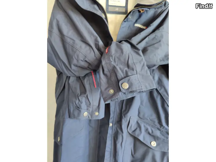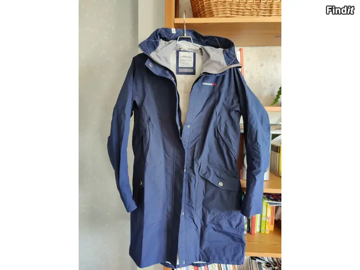 Vatten- och vindtät skaljacka, bra andningsförmåga, rymliga fickor, bra huva, mått armhåla-armhåla ca 50 cm, manschett från armhåla ca 57 cm, längd från nacke till fåll ca 95 cm, lite användad, bra i skick, färgen är mörkblå, ljuset på bilderna blekar färgen lite.