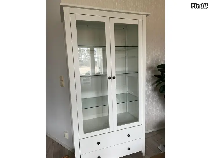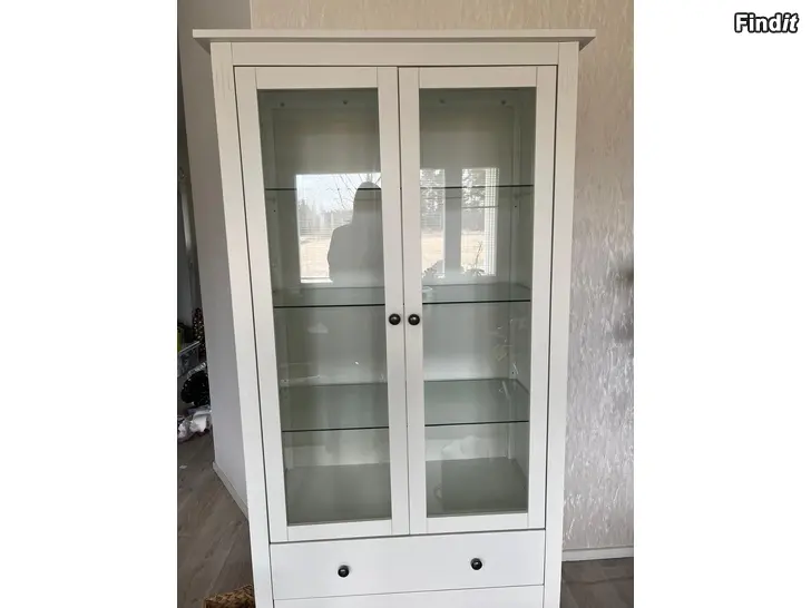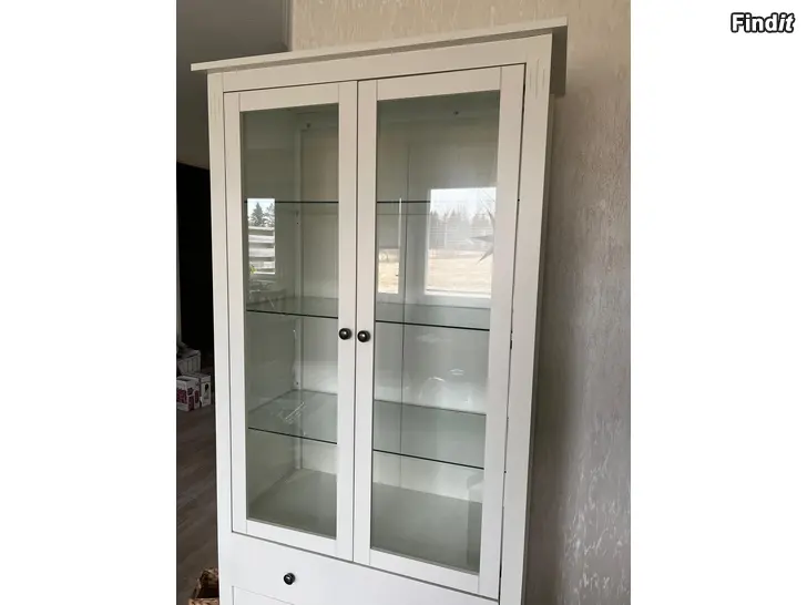 Vitt vitrinskåp med 3 glashyllor samt 2 lådor ner tills.