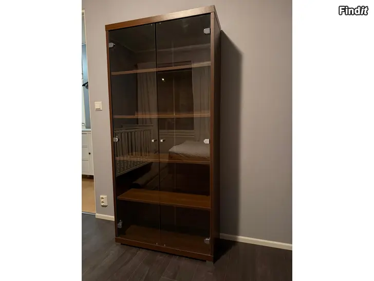Tummanruskea vitriinikaappi hyvässä kunnossa.