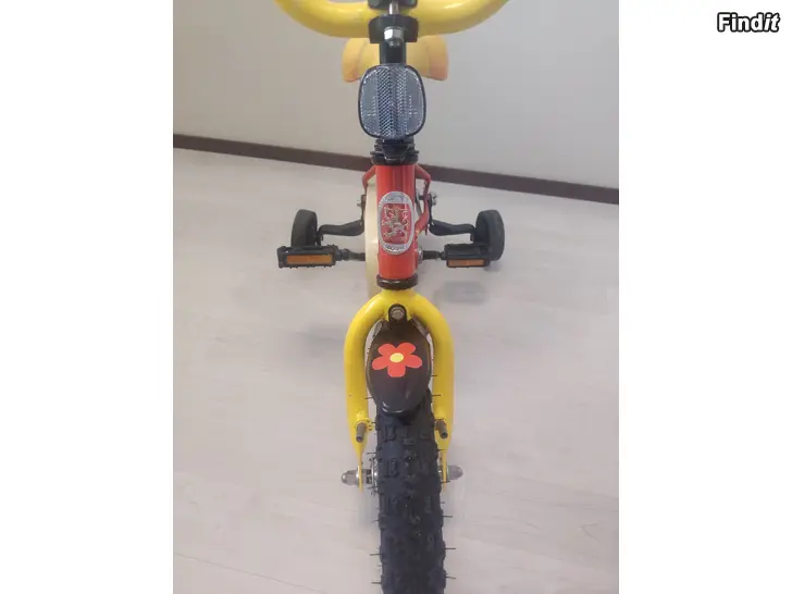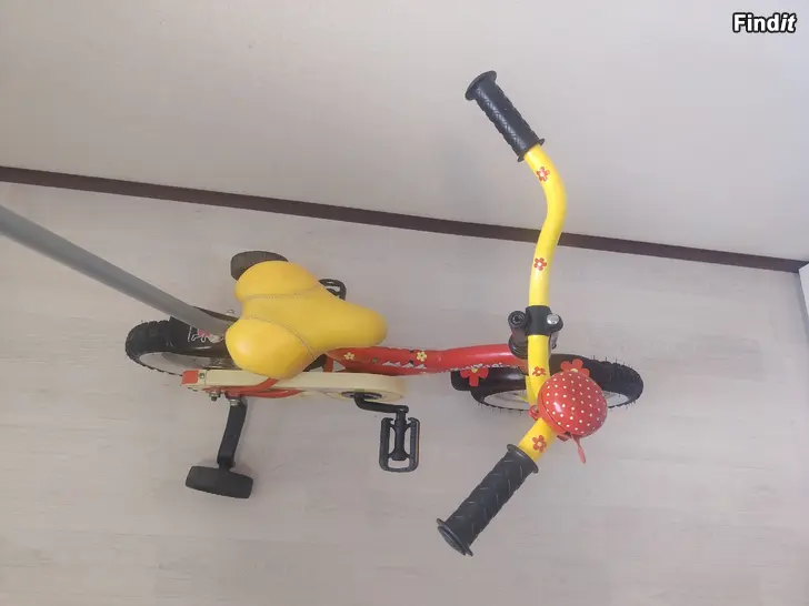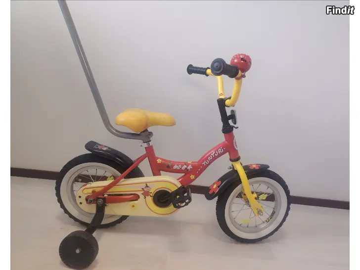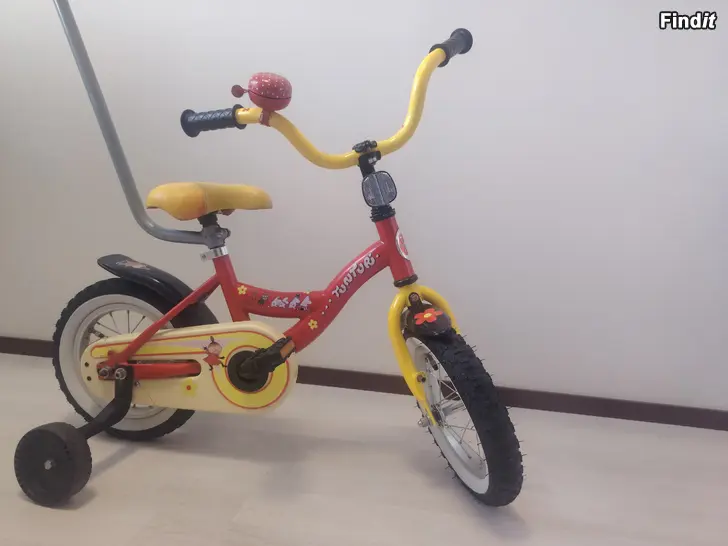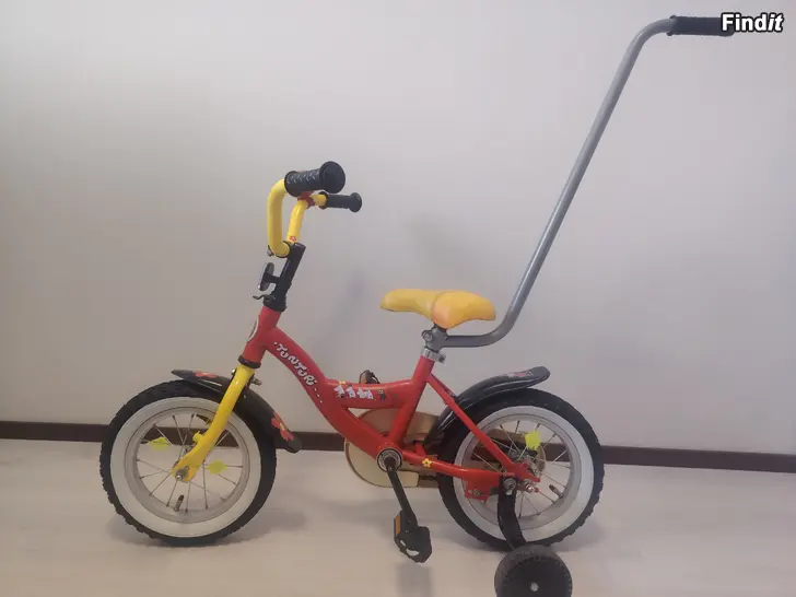 Helppokäyttöinen ja turvallinen lastenpyörä TUNTURI12, jossa on työntökahva ja apupyörät.