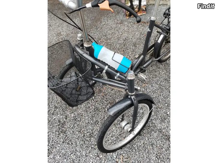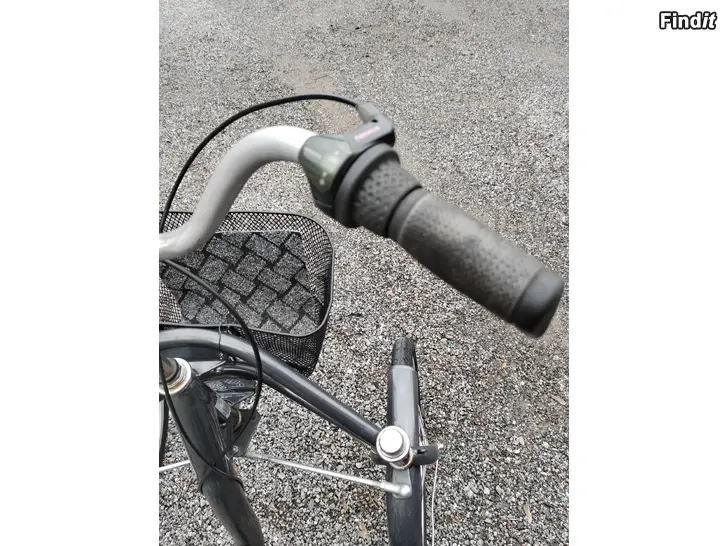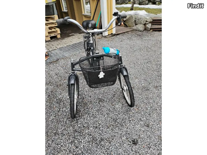 Suomalainen Helkaman pyörä. Edessä 2, takana yksi pyörä. Jalkajarru, edessä kori. Kevyt polkea.