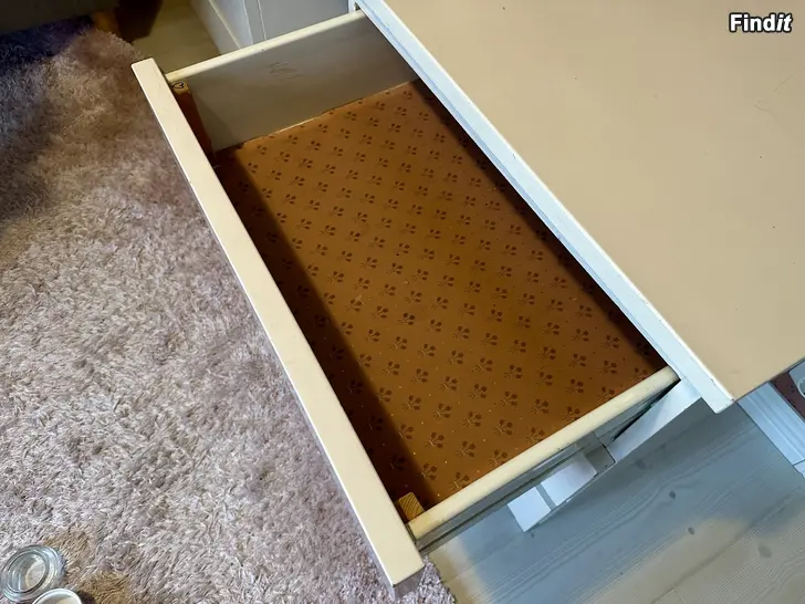 Säljes fint vitt och rejält skrivbord i massiv trä. Bordsskivan är löstagbar.