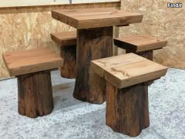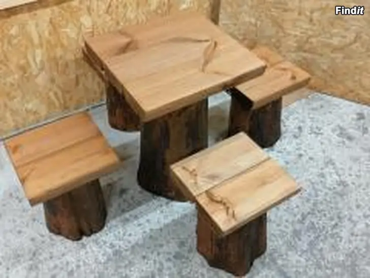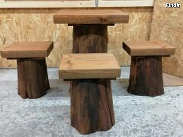 Varastontyhjennyksen johdosta myydään yksittäiskappale erittäin hyvään hintaan. Rajoitettu erä 1kpl myydään nopeimmalle. Tästä pihallesi upea kahvipöytäsetti, joka koostuu Pölli hirsipöydästä ja 4 kanto hirsituolista. Valmistetaan valikoiduista kotimaisista mäntytukeista.
