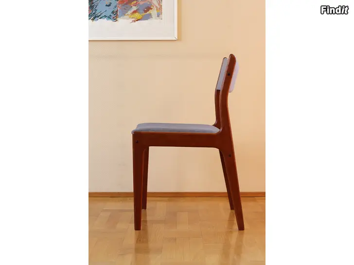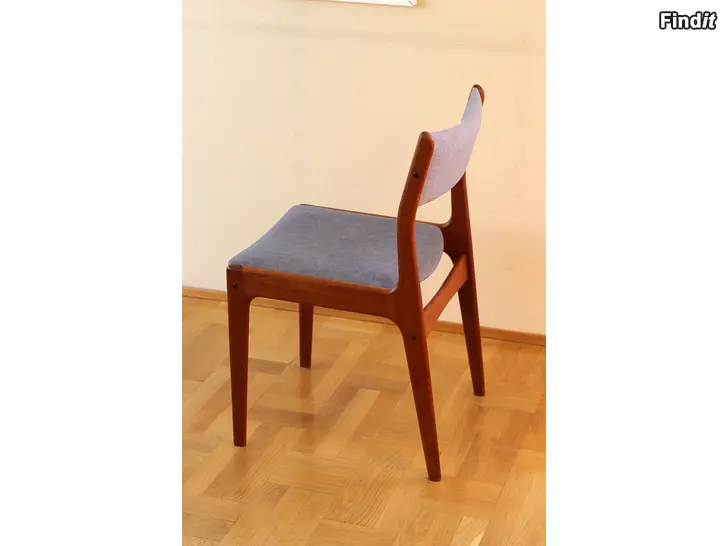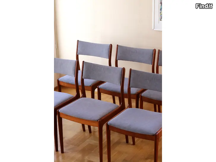 Tanskalaiset 1960-luvun tiikkiruokapöydän tuolit, suunnittelija Johannes Andersen, valmistaja Uldum Møbelfabrik. Tuolit on verhoiltu uudelleen kauniilla sinisellä samettikankaalla. Saatavilla 6 kappaleen sarjana, lisää tilattavissa. Hinta koko sarjalle.