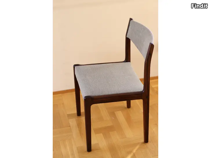 Tyylikkäät tanskalaiset ruusupuiset ruokapöydän tuolit, suunnittelija Johannes Andersen, valmistaja Uldum Møbelfabrik 1960-luvulla. Tuolit on kunnostettu ja istuimet on verhoiltu uudelleen kauniilla harmaalla kankaalla.
