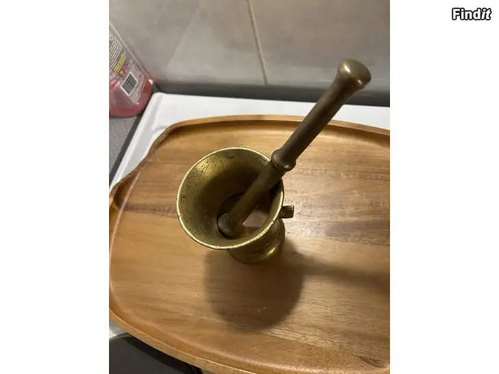 Messinki mortteli + tamppaaja , korkeus 11 cm ja halkaisija on 6 cm.