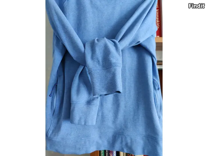 Lätt, mjuk och bekväm hoodie, tyg av 58 procent bomull, rymlig kenguruficka med dragkedjor, färg melerad ljusblå. Mått: armhåla till armhåla ca 56cm max ca 62 cm, ärm från armhåla till ärmslut ca 54 cm, längd från nacke till nederkant ca 64 cm. Hel, ren och i gott skick. Kan posta, frakt tillkommer.