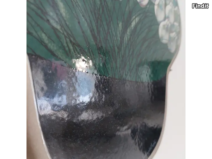 Itse laatta on ehjä ja hyväkuntoinen, mutta tummassa värissä lasitteen alla on pieniä nyppylöitä lähinnä kukkien varsien kohdalla viivoissa sekä korin yläreunassa Nämä näkyvät silloin, kun laattaa kääntelee käsissään ja valo tulee sivulta, jos osaa katsoa. Edestä päin katsoessa niitä ei huomaa. Viimeisessä kuvassa näkyy jotenkin, mistä on kyse.