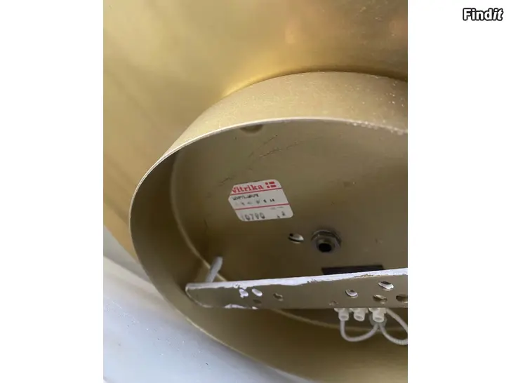 Myydään tyylikäs vintage-kattovalaisin tanskalaiselta Vitrika-merkiltä. Valaisimessa messingin värinen runko ja näyttävä kuvioitu lasikupu, joka hajottaa valon kauniisti.
