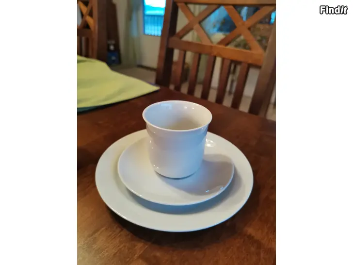 Valkoiset kahvikupit, aluslautaset ja kakkulautaset, 10 settiä.