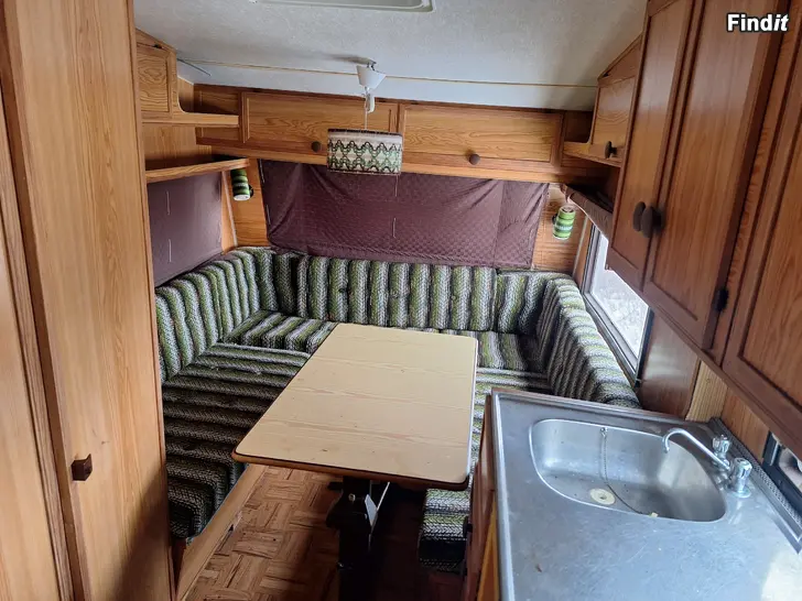 Gammal matkaaja husvagn, fin innuti men finns fuktskada under bänken