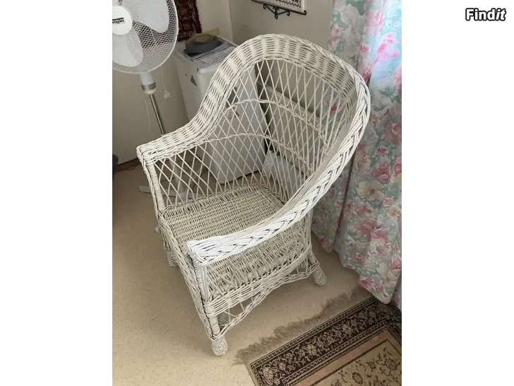 Mamma har flyttat till äldreboende och vi säljer bort en del överflödigt lösöre bl.a en vit korgstol från tidigt 90-tal. Tillverkaren är för oss okänd men stolen är hel och välhållen.