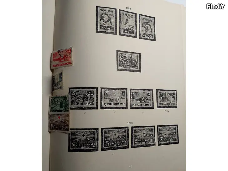 Vanha Suomi-kansio-postimerkkialbumi, johon muutama merkki jo kiinnitettynä ja yhteensä yli 780 kpl. postimerkkejä. Albumin sisäkannessa sen lahjaksi saaneelle omistuskirjoitus vuodelta 1940 . Suurin osa suomalaisia, mukana lisäksi useita ulkolaisia, ainakin amerikkalaisia, venäläisiä ja unkarilaisia merkkejä. Sen verran etsin eräältä suomalaiselta nettisivulta, että mukana yksi noin 6.40 € arvoinen, yli 100 kpl. erilaisia leijonavaakunamerkkejä, joiden arvoja en jaksanut tutkia, 4-7 kpl. ”Vanhan Vaasan palosta 100 vuotta” –merkkejä. Muutamille merkeille en läytänyt vastaavuutta ko. sivuilta. Melkein kaikki merkit 0,40-2 €, kymmeniä 0.8-2 € arvoisia. Hintapyynti perustuu keskimääräiseen arvioon noin 780 x 0,60 €. Myyn tämän vain kokonaisuutena, en ryhdy etsimään joukosta, jos haluaisit jonkun harvinaisemman merkin erikseen. Jos kiinnostaa, tee tarjous?