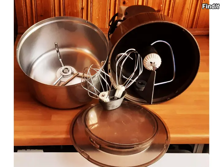Bosch monitoimikone ilman tehosekoitinkannua/toimintoa sis., ruskean muovikulhon taikinakoukulla ja vispiläkoukut sekä metallikulho taikinakoukulla, muovikansi käy molempiin kulhoihin.