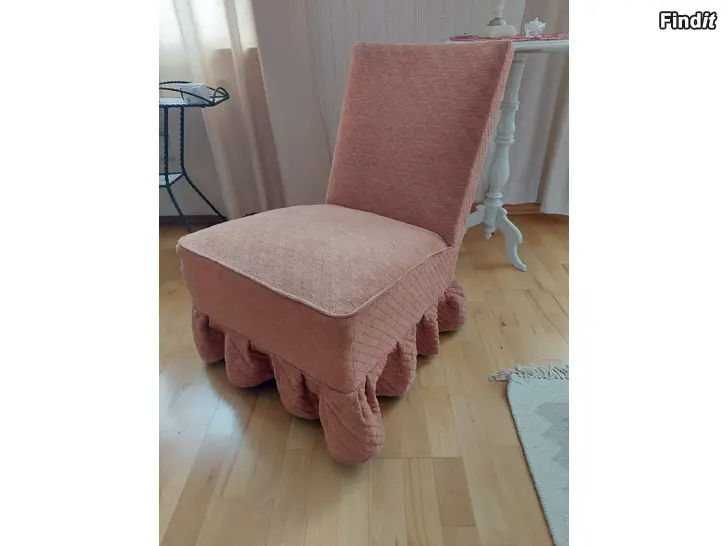 Roosa/aprikoosin värinen romanttinen nojatuoli, joka on oikein hyvässä kunnossa. En romantisk fåtölj i rosa/aprikosfärg som är i mycket gott skick.