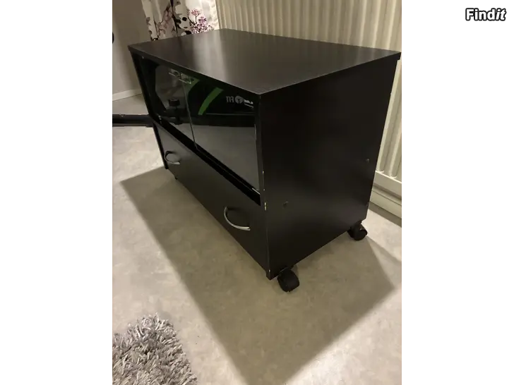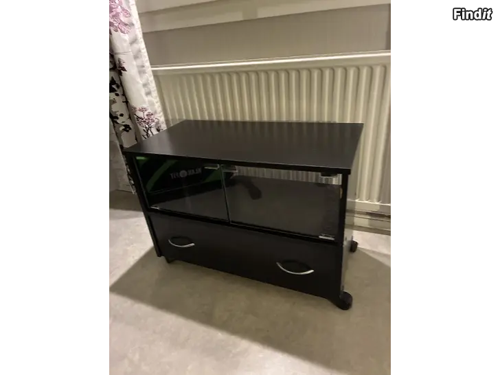 TV-taso lasiovilla ja laatikolla. Alla on pyörät. Lev. 70 cm, syv 35 cm, kork. 50 cm. Muutamia kulumia oikeassa reunassa, joista maali lähtenyt pois.