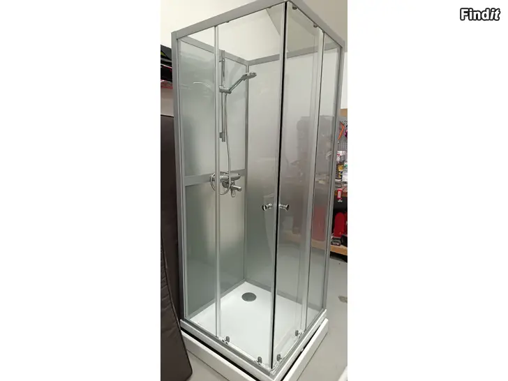 Duschskåp i nyskick, som använts i två veckor pga. renovering. 80x80x205 cm. Välanvänd men fungerande blandare som syns på bild och nya kopplingsslangar för blandaren fås med.