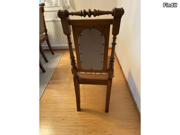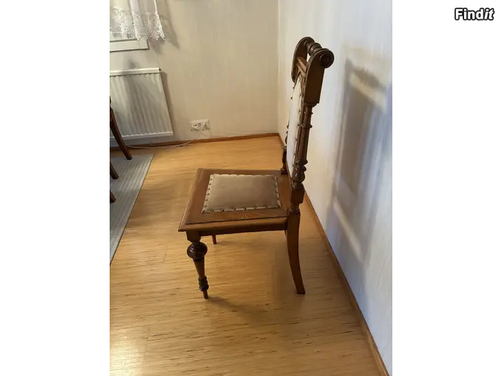 kpl vanhoja tammituoleja. Puusepän vanhalla puuliitostyylillä entisöimiä. Olleet aikoinaan Vaasan kaupungin tiloissa edustus-/kokouskäytössä. Puusepän valmistama tuolien tyyliin sopiva tammipöytä. Pöydän lev. 100cm, pituus 160cm + 39cm lisälevy