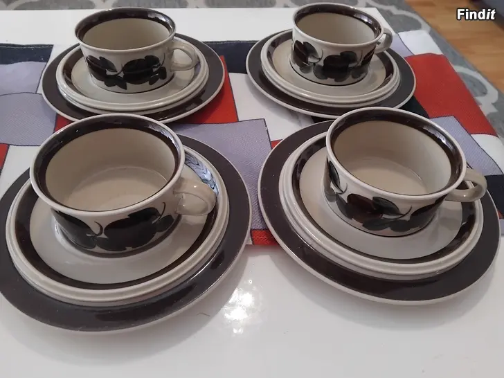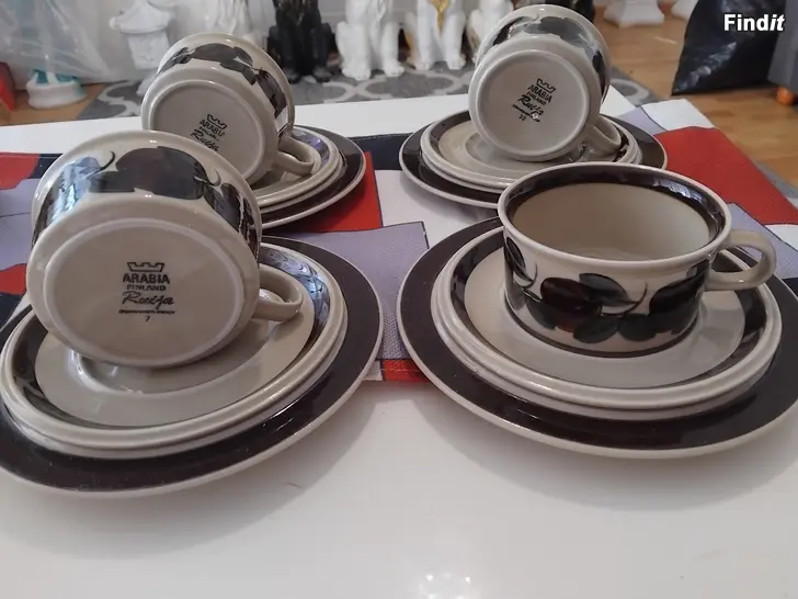 Arabia Ruija isot teekupit ja asetit ja leivoslautaset 4+4+4