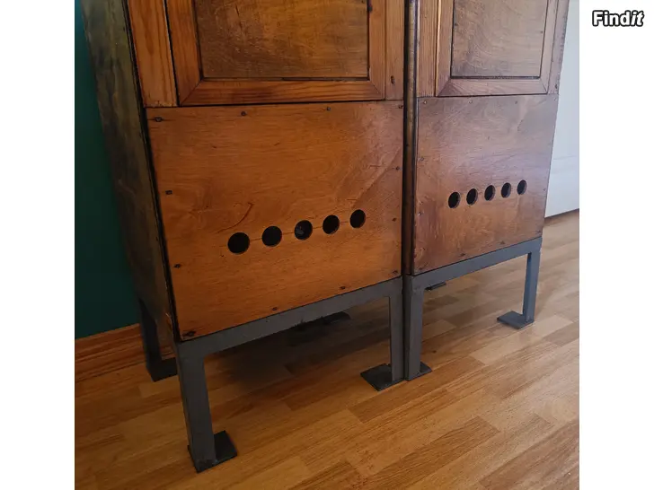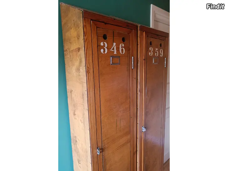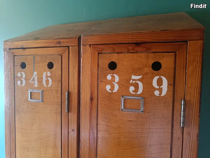 Två gamla skåp från omklädningsrum i Wärtsilä, Jakobstad. Från 40-/50-talet. Ärvts av släkting som jobbade där och då. Förvarats inomhus, bra skick! Höjd ca 190 cm, bredd ca 32 cm, djup ca 28 cm. Säljes tillsammans. Finns och hämtas i Jakobstad. 300€ för båda, eller bjud.