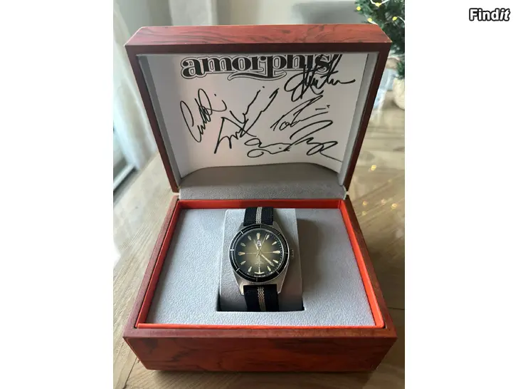 Hienokuntoinen kello joustorannekkeella. Yhtyeen jäsenten signeeraama laatikko.