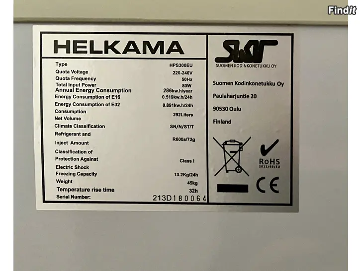 HELKAMA frysbox, 292 liter. 5-6 år gammal. Höjd 84 cm, bredd 105 cm, djup 74 cm. Finns i Smedsby.