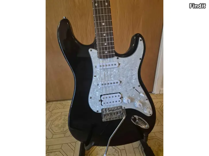 En perfekt gitarr för alla som är intresserade att lära sig musik. Gitarren är använd men i mycket bra skick. Nyligen städad och med nya 11-gauge nickel strängar. Både kroppen och halsen är båda gjorda av trä, detta gör gitarren något tyngre men ger bättre resonans och ett mera naturligt ljud än en plast gitarr. Till priset ingår även golvställningen.
