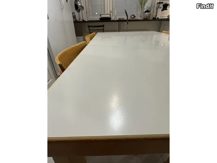 Bordet har en blank vit laminatyta. Skicket är bra, men det finns lättare ytliga repor från normal användning, som syns främst i vissa ljus. Stolarna har också spår av användning, men är överlag i fint och bra skick.