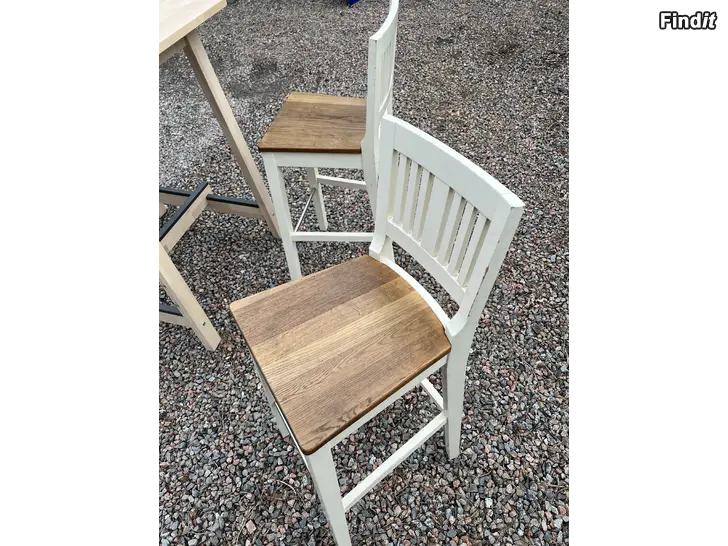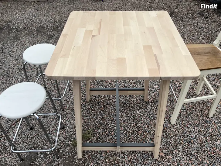 Litet, praktiskt bord med 4 st barstolar enligt bilderna. Allt i bra skick, endast nån mindre skråma på stolarna. Bordet 100 cm högt, bordsskivan 75 x 75 cm.