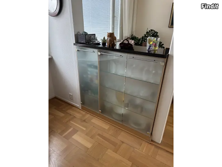 Vitrinskåp 120L/100H, bänkskivans djup ovanpå skåpen 35 cm.