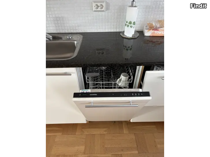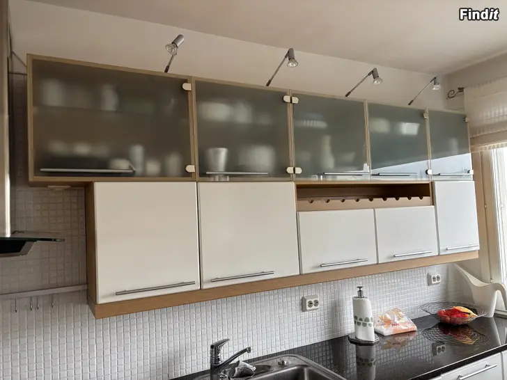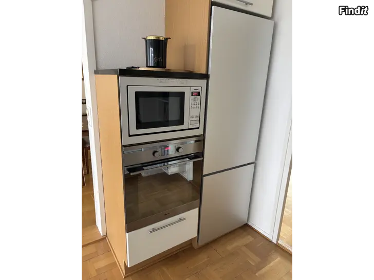 Hyvin pidetty keittiökokonaisuus, johon kuuluu ylä- ja alakaapistoja, lasiovellisia kaappeja, tasokaappeja sekä vetolaatikoita. Kokonaisuuteen sisältyy liesituuletin, keittotaso, integroitu astianpesukone 40cm, uuni, mikroaaltouuni, jääkaappipakastin. Kivitaso 3,2 cm paksu, teräksinen tiskiallas. Sopii asennettavaksi olemassa olevaan keittiötilaan, jossa halutaan yhtenäinen kaapisto- ja kodinkoneratkaisu.