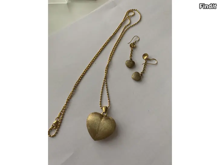 Kaunis kullan värinen sydän + ketju ja korvakorut.
