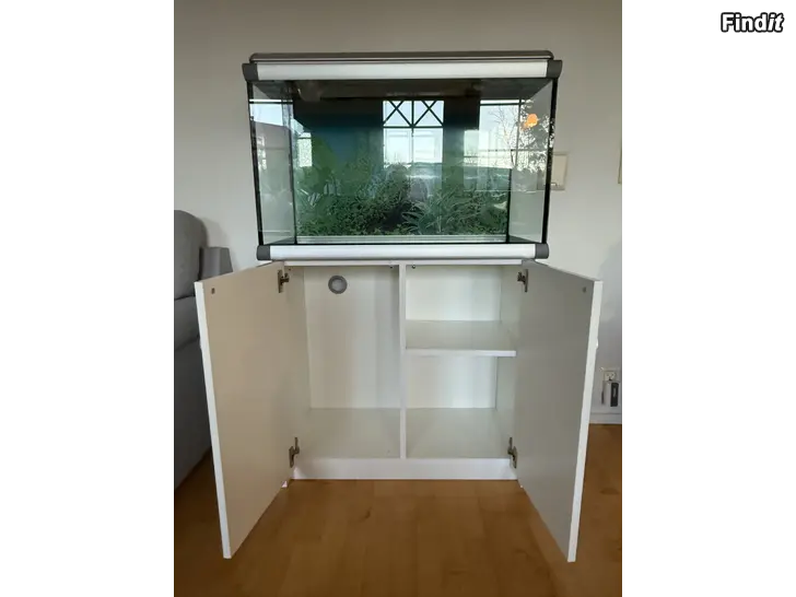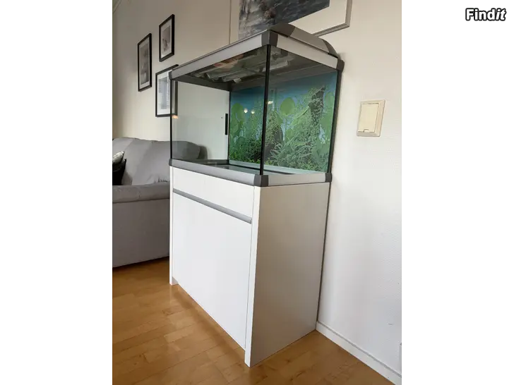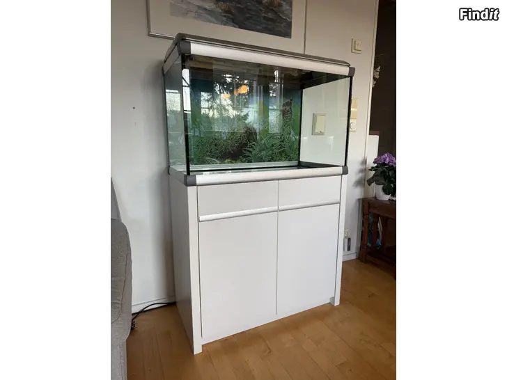Till salu: ett stilrent och välskött danskt Akvastabil Mark II-akvarium med tillhörande vitt skåp. Akvariet har aluminiumsfärgade ramar och skåpets bakstycke är försett med genomföringsöppningar för slangar och kablar. Akvariet är för närvarande inte i bruk.