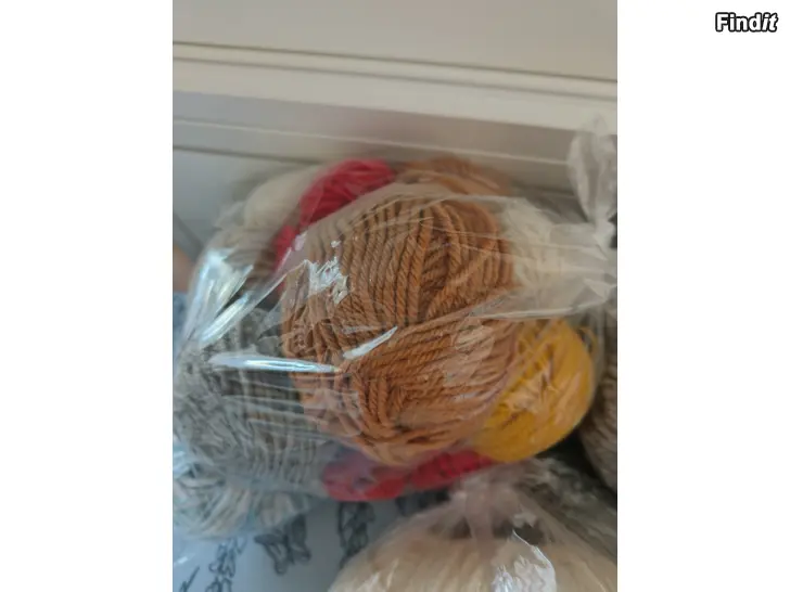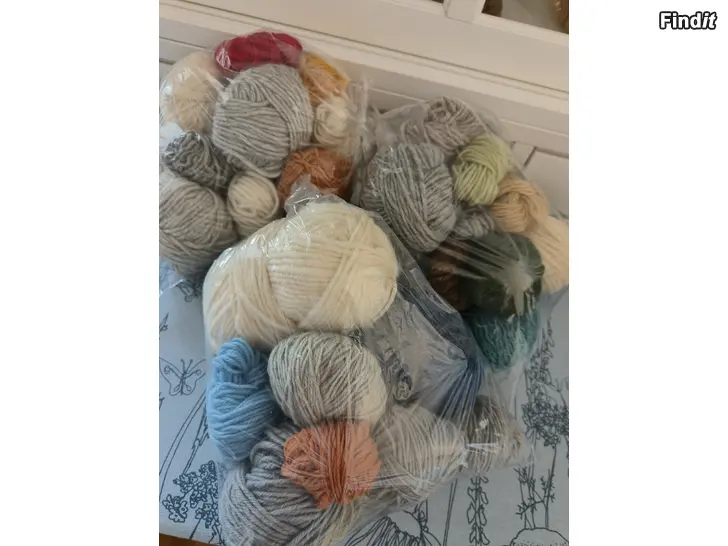 Kuvien korillinen kankaita . Etupäässä villa ja karvaisia . Paperikassillinen huopuvia lankoja . Sekä kolme pikkupussia käytöstä jääneitä loppukeriä vaikka jämälankaprojektiin .